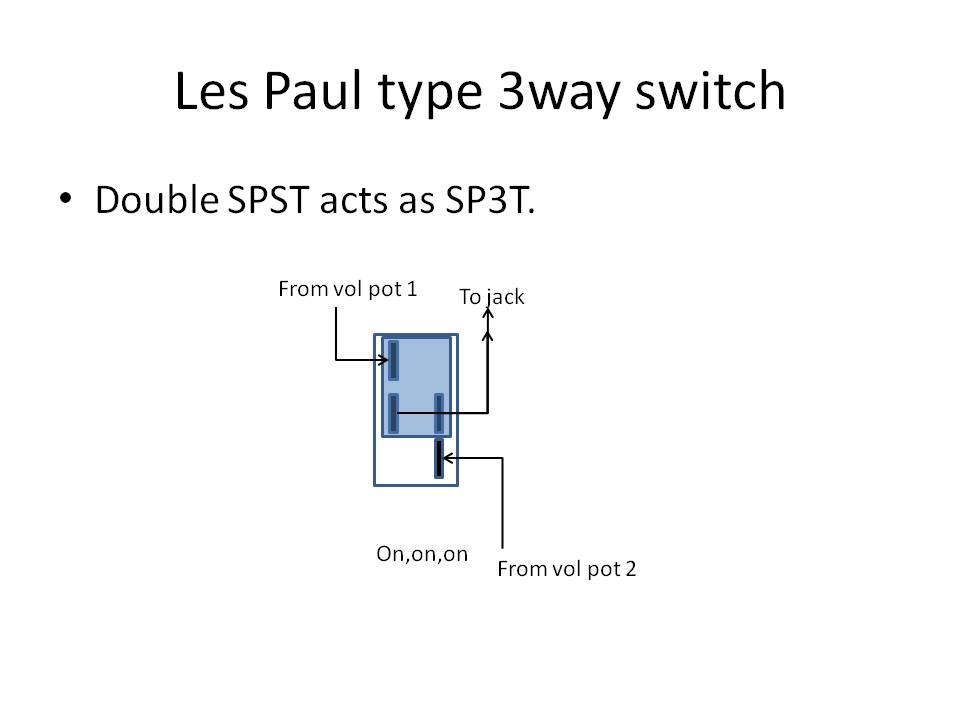 Les Paul 3way switch. This is a DP3T switch (at least behaves like one). Another name for this type of switch is on/on/on. The picture under shows how you can emulate a LP switch with standard DPST toggle switches. More about it later.
