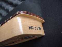 Now do some setup of the trem. I've used a method described by Dan Erlewine. to mount and simultaneously setup the tremolo. You need to make a wedge shaped wooden block, 6 cmwide, 5 cm high and tapering from about 1.8 cm to .6 cm. You may want to have a few blocks with slightly different dimensions. As soon as you have a string mounted you can set up the trem in your favourite position using the block as in the photograph, no springs yet.